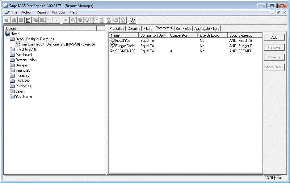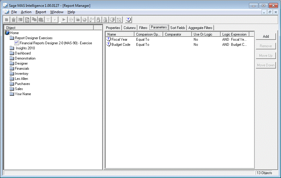 Select the Parameters tab of the Financial Reports Designer report. You will see that there are already two parameters ? the fiscal year required and the budget set. Select the 'Add' button on the right.