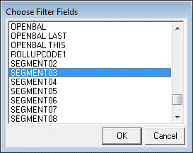 The graphic above, taken from the ABC demo company in MAS 90 shows some of the columns of information in the Financial Reports Designer and highlights that all 10 segments are available. We can now apply a parameter to the report that allows for the selection of specific segments: