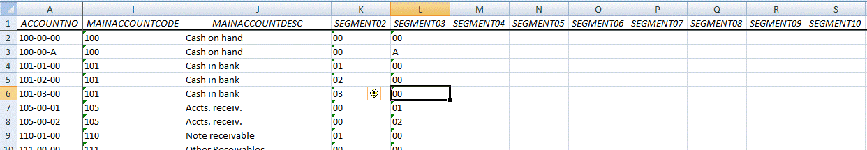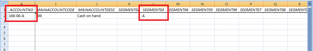 The report will then run, extracting all accounts where the 3rd segment code equals A. The graphic below shows the raw data of this report:
