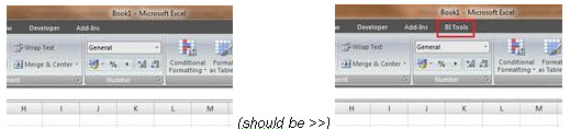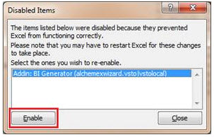 Note: Generally, when you complete the above step, the BI Generator add-in will change from Disabled to Inactive. You will need to follow the steps documented above (Enable Inactive Add-in) to get the BI Tools menu to appear.