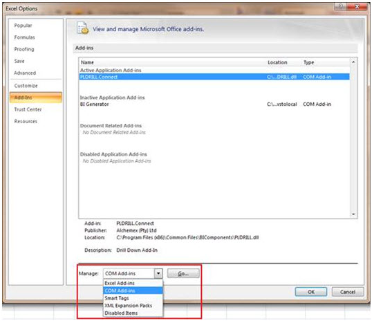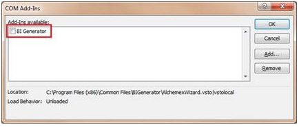 If the BI Generator add-in is located in Inactive Application Add-ins, then select COM Add-ins from the Manage list and click Go: