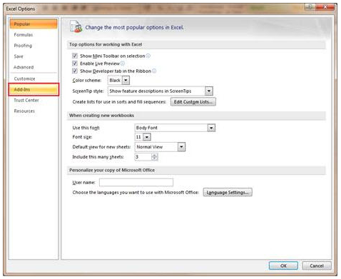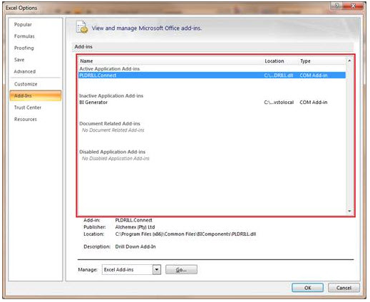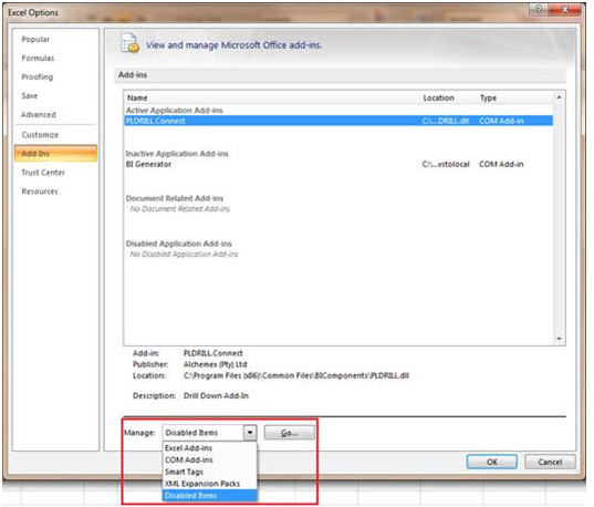 If the BI Generator add-in is located in Disabled Application Add-ins, then select Disabled Add-ins from the Manage list and click Go: