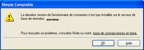 Raison commercialeSuite à l'installation de la version 2009 de Simple Comptable, je reçois le message "La dernière version du gestionnaire de connexion n'est pas installée sur le serveur base de données, Nom du serveur" et je ne peux ouvrir ma base de données sur ce serveur. Comment corriger ce problème ?