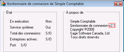 Le gestionnaire de connexion de Simple Comptable 2009 à la base de données n'est pas à jour ? Comment le mettre à jour ? Comment vérifier la version du gestionnaire de connexion de Simple Comptable ? Depuis la version 2008 de Simple Comptable, l'accès aux donnéess'effectue via le gestionnaire de connexion de Simple Comptable. Si vous ouvrez une base de données située sur un serveur, il faut s'assurer que la version du gestionnaire de connexion de Simple Comptable est identique à celle de votre poste de travail. Pour vérifier les versions installées respectivement sur le serveur et les postes de travail, double-cliquez sur l'icône La fenêtre ci-dessous apparait. La version est indiquée en haut à droite.