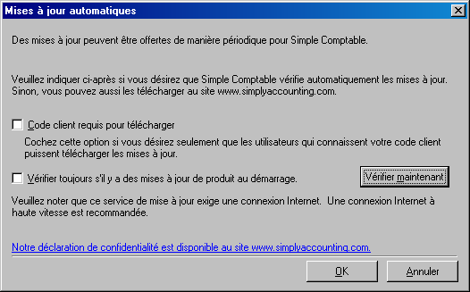 Solution:Comment mettre à jour Simple Comptable de Sage 2007 et 2008 avec les mises à jour de l'impôt du 1er Janvier 2008 ? Note: Pour vérifier quels sont les tables d'impôts que vous utilisez, allez dans le menu Aide, A propos de Simple Comptable et cliquez sur le bouton Info - Support tech…. 1ère méthode Allez sur le site www.simplyaccounting.com/myaccount Note: si vous entrez l'adresse URL, vous devez inclure les " www ".