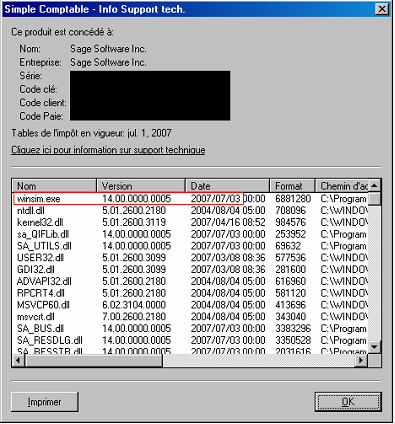 Solution ou Solution de rechangeLa mise à jour est installée correctement mais Simple Comptable est incapable d’afficher la nouvelle version puisque les dispositifs de sécurité du système Vista l’en empêche. Simple comptable de Sage, autant la version 2007 que les versions antérieures, enregistre l’information relative à la version dans un fichier .DAT à l’intérieur du répertoire d’installation de Simple Comptable qui est situé par défaut dans le répertoire Programmes (Program Files). À la différence des versions précédentes de Windows et pour des raisons de sécurité, Vista ne permet pas la lecture des fichiers .DAT qui sont enregistrés à l’intérieur du répertoire Programmes (Program Files) Note: Ce problème se produit seulement lorsque l’installation du logiciel est faite à l’intérieur du répertoire Programme (Program Files) lequel est le répertoire d’installation par défaut de Simple Comptable et de la majorité des autres logiciels. Si vous installez Simple Comptable dans un répertoire d’installation différent, Simple Comptable affichera la version correctement. Voici une méthode alternative pour vérifier la version de l’application Simple Comptable: - Vérifier si la date de modification du fichier winsim.exe correspond à la date à laquelle vous avez fait l’installation de la mise à jour.
