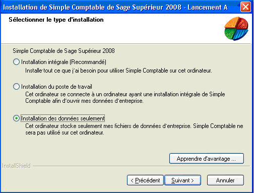 R: Simple Comptable 2008 doit être installé sur l'ordinateur où est enregistré le fichier d'entreprise. Par exemple, si vous utilisez un serveur de fichiers, veuillez installer la version intégrale de Simple Comptable sur le serveur ainsi que sur les postes de travail.Si l'ordinateur est utilisé uniquement pour l'enregistrement des données et qu'il n'y aura pas d'utilisation de l'application Simple Comptable sur ce poste, Veuillez faire l'installation en sélectionnant l'otpion Installation des données seulement.