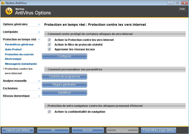 - Cliquez sur Paramètres, Sélectionnez Navigation Web, Protection contre les vers Internet et sélectionnez Configurer.