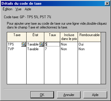 6. Refaire l'étape 3 à 5 pour chaque code de taxe utilisant la TPS au taux de 5%.