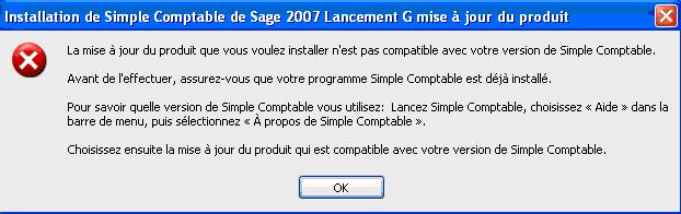 Questions et RéponsesQ: Lorsque vous exécutez la mise à jour de Simple Comptable (Tables d'impôts), le message d'erreur : « La mise à jour du produit que vous voulez installer n’est pas compatible avec votre version de Simple Comptable. » (Cf. ci dessous). Simple Comptable 2007 :