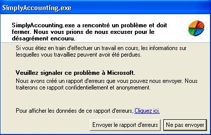 La version de Simple Comptable 2008 fonctionnait correctement mais depuis quelques jours je reçois le message d'erreur : " SimplyAccounting.exe a rencontré un problème et doit fermer ".